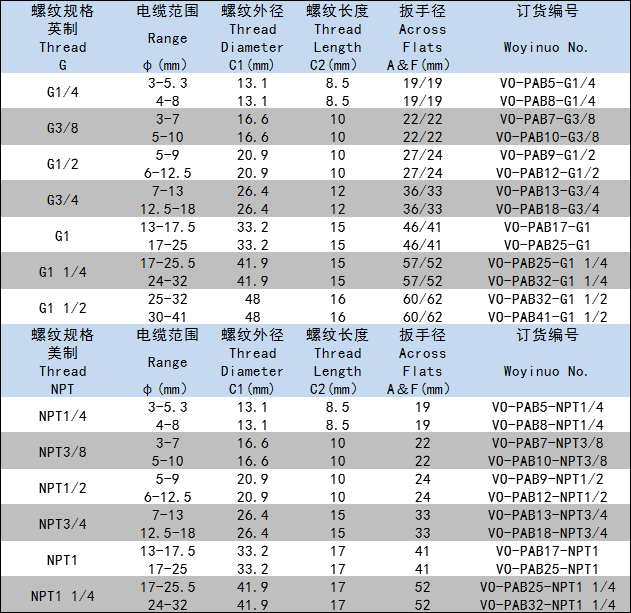 使用方法:VO-PAB型尼龍電纜接頭是電纜的配套產品,接頭可將電纜鎖緊,另一端可接入設備箱體上,也可以根據選用螺紋,接入進出口為內螺紋的電動設備上。